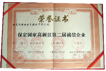 2009年1月16日,我公司获得了保定市高新区第二届《诚信企业》的荣誉称号。这次评选活动由保定国家高新区党工委、管委会组织,经济发展局等八家单位联合在全区范围内组织开展的评选活动。在这次评选活动中,我公司在诚信经营机制、合同管理、信用管理制度等方面都表现优秀,经过部门评价、社会公示、综合评比等严格的审查评选后,再次顺利当选为高新区的第二届诚信企业。以此荣誉为开始,再接再厉,今后公司要不断加强企业信用意识,日益完善信用体系,弘扬“以诚兴企、以信立区”的发展观念。