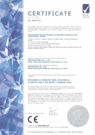 热烈祝贺我公司“LBD-MGR微机发电机变压器组故障录波分析装置”通过了欧盟CE认证,为该产品进军欧盟打下了坚实的基础。在欧洲经济区(欧洲联盟、欧洲自由贸易协会成员国,瑞士除外)市场上销售的商品中,CE标志的使用越来越多,LBD-MGR微机发电机变压器组故障录波分析装置加贴CE标志表示其符合安全、卫生、环保和消费者保护等一系列欧洲指令所要表达的要求。